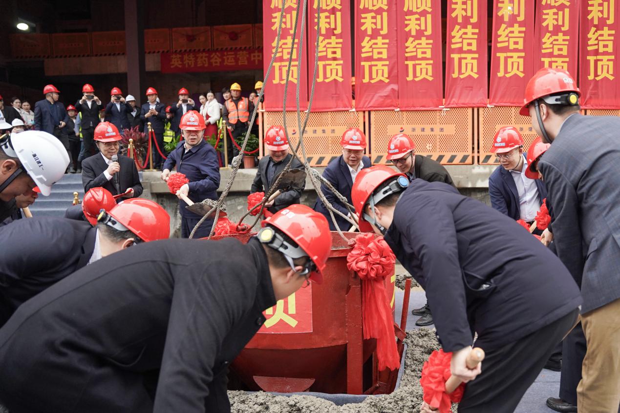 結(jié)頂儀式上,出席儀式的嘉賓們揮動(dòng)金鏟,在禮炮奏鳴聲中,共同將封頂金土送入大鼎之中。隨著大鼎升懸,英特集團(tuán)黨委書(shū)記、董事長(zhǎng)應(yīng)徐頡宣布:“英特集團(tuán)英特藥谷運(yùn)營(yíng)中心項(xiàng)目喜結(jié)金頂!”